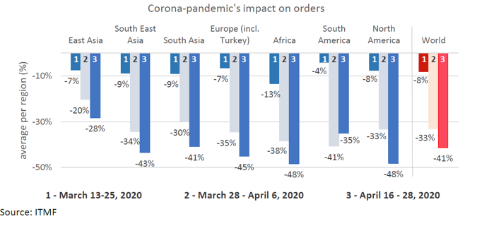 值得注意的是,東亞地區(qū)的訂單降幅為28%,明顯低于其他所有地區(qū)(41%及以上)。可以假設(shè),這個(gè)地區(qū)首先受到新冠疫情帶來(lái)的影響,也首先從危機(jī)中恢復(fù)。特別是中國(guó)和韓國(guó)成功地控制了疫情,在過(guò)去的幾周里,大多數(shù)中國(guó)紡織企業(yè)都大幅提高了產(chǎn)量。同時(shí),線(xiàn)下零售店也重新開(kāi)張,東亞國(guó)家的消費(fèi)開(kāi)始逐步恢復(fù)。但是消費(fèi)情況將如何變化,還有待進(jìn)一步觀望。