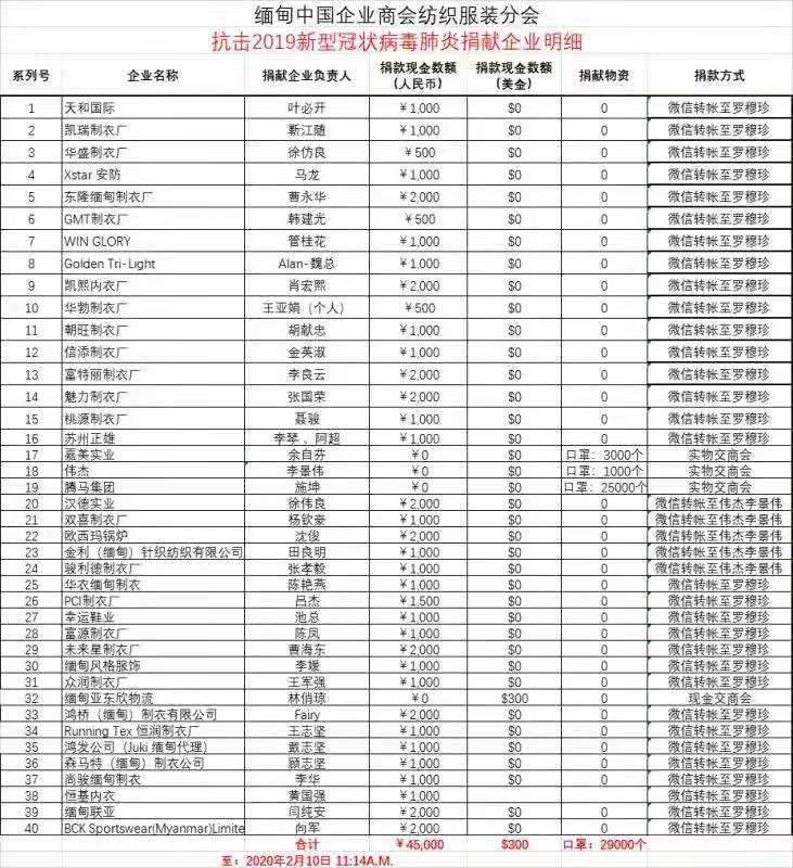 緬甸中國商會在1月27日即面向在緬中資企業(yè)發(fā)出了“緬甸中國企業(yè)商會支援祖國,抗擊新型冠狀病毒感染肺炎倡議書”,隨后成立了疫情防控和捐贈協(xié)調(diào)工作小組,設(shè)定專人分工負責(zé)捐贈事宜的協(xié)調(diào)和物資信息登記等工作。作為緬甸中國商會的主要分支機構(gòu),緬甸中國商會紡織服裝分會積極動員會員企業(yè)捐款捐物。截至2月10日,緬甸中國企業(yè)商會紡織服裝分會共收到在緬中資紡織服裝企業(yè)的捐款將近人民幣5萬元,以及捐贈口罩29000個。