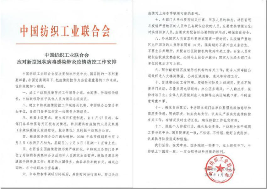 中國(guó)紡織工業(yè)聯(lián)合會(huì)及下屬各分行業(yè)協(xié)會(huì)積極應(yīng)對(duì)疫情變化,在開(kāi)展組織內(nèi)部防疫的同時(shí),迅速而有條不紊地開(kāi)展行業(yè)企業(yè)的生產(chǎn)指導(dǎo)工作。