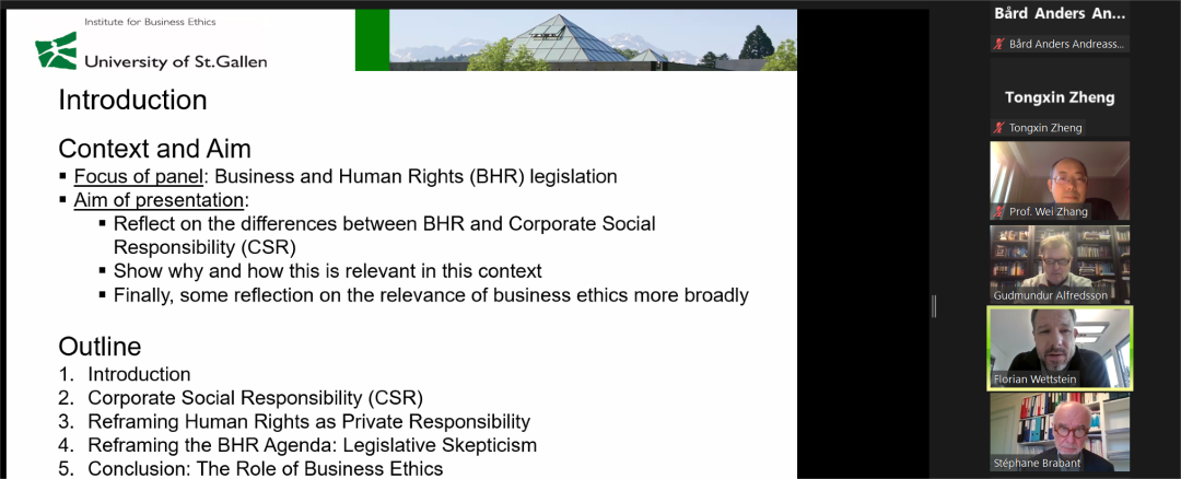 論壇第三單元由中國政法大學(xué)人權(quán)研究院特聘教授古德蒙德·阿爾弗雷德松(Gudmundur Alfredsson)主持,現(xiàn)任歐盟委員會法律事務(wù)委員,曾任比利時副總理兼外交部長迪迪埃·雷恩戴爾(Didier Reynder)先生、巴黎三一國際(Trinity LLP)高級合伙人史蒂芬·布拉班特(Stéphane Brabant)先生、瑞士圣加侖大學(xué)商業(yè)倫理研究院佛洛里安·維特斯坦(Florian Wettstein)教授、挪威人權(quán)中心的巴德·安德斯·安德烈亞森(Bard Anders Andreassen)教授、丹麥人權(quán)研究院高級顧問凱瑟琳·布洛赫·韋貝格(Cathrine Bloch Veiberg)、轉(zhuǎn)變公司標準部門副主任魯本·贊德弗利特(Ruben Zandvliet)先生等來自國外的工商業(yè)與人權(quán)領(lǐng)域的專家,圍繞“企業(yè)人權(quán)和環(huán)境責任:區(qū)域與國家立法”的主題展開討論,會上特別就歐盟對企業(yè)責任的區(qū)域立法與國家立法進行了詳細的介紹和說明,還從理論與實踐的層面說明了通過國內(nèi)立法,使UNGP由國際軟法轉(zhuǎn)向國內(nèi)硬法,使工商企業(yè)承擔保護人權(quán)責任和義務(wù)的必要性與重要性。同時,專家們還有與會嘉賓對“挪威透明法案”“企業(yè)人權(quán)盡責立法的國家實踐”和“企業(yè)責任與商業(yè)倫理”“企業(yè)人權(quán)責任如何(重塑)法律的?”等話題展開熱烈討論。