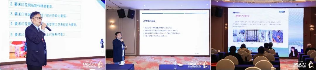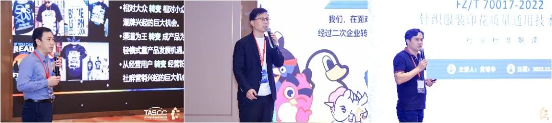 在紡織服裝印花科技發(fā)展會議上,與會企業(yè)代表紛紛獻(xiàn)計(jì)獻(xiàn)策。田菱精密網(wǎng)版科技(昆山)有限公司精密制版事業(yè)部部長秦頎新分享了激光快速制作高精細(xì)印花網(wǎng)版的要求和性能優(yōu)勢;杭州景華紡織科技有限公司總經(jīng)理梁樹奇闡述了滌綸面料免洗數(shù)碼直噴工藝以及在服裝及運(yùn)動面料上的應(yīng)用前景;沈陽飛行船數(shù)碼噴印設(shè)備有限公司紡織事業(yè)部總經(jīng)理陳艷艷就精準(zhǔn)高效的雙面同步數(shù)碼噴墨印花技術(shù)及市場進(jìn)行了分析;廣州三義文訊科技有限公司總經(jīng)理李巖就企業(yè)如何應(yīng)對T恤印花“一件起訂”柔性生產(chǎn)新趨勢提出了新解決方案;紅紡文化有限公司IP授權(quán)中心創(chuàng)新事業(yè)部總經(jīng)理王海濱就IP服裝印花的潮流趨勢進(jìn)行了展望;中山市紡織工程學(xué)會會長黃明華詳細(xì)解讀了行業(yè)標(biāo)準(zhǔn)《針織服裝印花質(zhì)量通用技術(shù)要求(FZ/T 70017-2022)》。