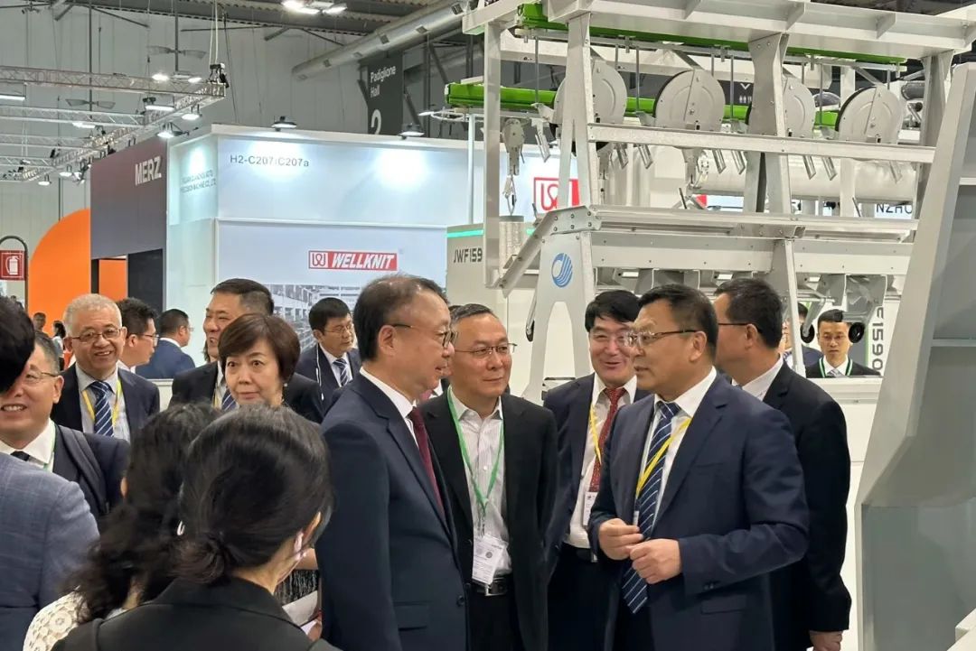 6月10日,代表團一行應邀參觀了歐洲國際紡織機械展(ITMA)。期間,孫瑞哲一行走訪了中國恒天、遠信工業(yè)、三技精密技術、慈星、歐瑞康、特呂茨勒、圣東尼、意達、蘭精、村田、必佳樂等企業(yè)展臺;調研最新紡織品和服裝加工技術、機械和材料;見證達利絲綢(浙江)股份有限公司和瑞士史陶比爾集團簽約。中國紡織機械協(xié)會會長顧平、中國國際貿易促進委員會紡織行業(yè)分會常務副會長梁鵬程等隨同參觀調研。