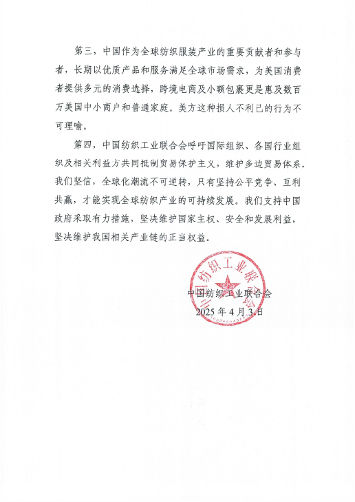 第四,中國(guó)紡織工業(yè)聯(lián)合會(huì)呼吁國(guó)際組織、各國(guó)行業(yè)組織及相關(guān)利益方共同抵制貿(mào)易保護(hù)主義,維護(hù)多邊貿(mào)易體系。我們堅(jiān)信,全球化潮流不可逆轉(zhuǎn),只有堅(jiān)持公平競(jìng)爭(zhēng)、互利共贏,才能實(shí)現(xiàn)全球紡織產(chǎn)業(yè)的可持續(xù)發(fā)展。我們支持中國(guó)政府采取有力措施,堅(jiān)決維護(hù)國(guó)家主權(quán)、安全和發(fā)展利益,堅(jiān)決維護(hù)我國(guó)相關(guān)產(chǎn)業(yè)鏈的正當(dāng)權(quán)益。