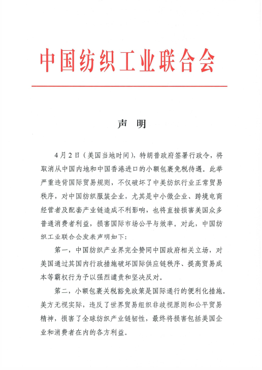 4月2日(美國(guó)當(dāng)?shù)貢r(shí)間),特朗普政府簽署行政令,將取消從中國(guó)內(nèi)地和中國(guó)香港進(jìn)口的小額包裹免稅待遇。此舉嚴(yán)重違背國(guó)際貿(mào)易規(guī)則,不僅破壞了中美紡織行業(yè)正常貿(mào)易秩序,對(duì)中國(guó)紡織服裝企業(yè),尤其是中小微企業(yè)、跨境電商經(jīng)營(yíng)者及配套產(chǎn)業(yè)鏈造成不利影響,也將直接損害美國(guó)眾多普通消費(fèi)者利益,損害國(guó)際市場(chǎng)公平與效率。對(duì)此,中國(guó)紡織工業(yè)聯(lián)合會(huì)發(fā)表聲明如下: