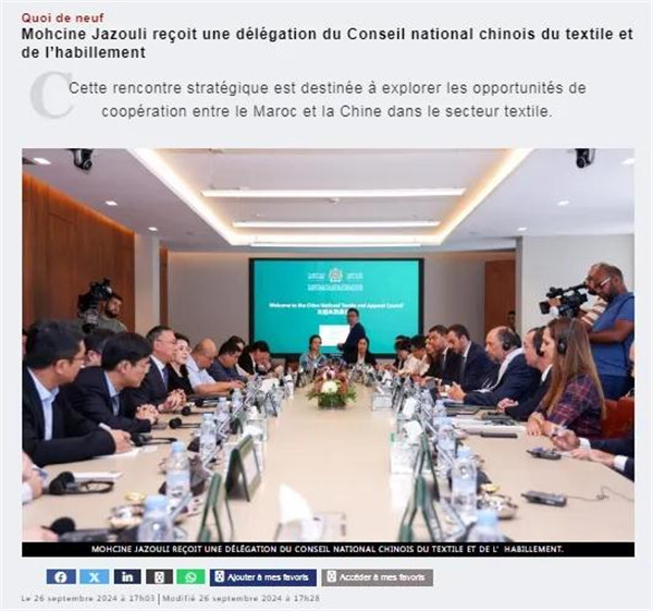 在兩國各領(lǐng)域深化合作持續(xù)推進的背景下,由中國紡織工業(yè)聯(lián)合會副會長、中國國際貿(mào)易促進委員會紡織行業(yè)分會會長徐迎新率領(lǐng)的23人紡織服裝企業(yè)家代表團于2024年9月24-30日訪問非洲之行的第二站——摩洛哥。中國紡織工業(yè)聯(lián)合會副會長端小平、中國麻紡織行業(yè)協(xié)會會長董春興、中國印染行業(yè)協(xié)會監(jiān)事長陳志華、中國棉紡織行業(yè)協(xié)會、中國化學(xué)纖維工業(yè)協(xié)會、中國服裝協(xié)會相關(guān)領(lǐng)導(dǎo)、蘭西天纖坊亞麻有限公司、魯泰紡織股份有限公司、遠信工業(yè)股份有限公司、杭州觀晨實業(yè)有限公司、浙江錦馬自動化科技有限公司、浙江金彩新材料有限公司、新德集團有限公司、江蘇新瑞貝生物科技股份有限公司、天希進出口貿(mào)易(廣州)有限公司等企業(yè)的企業(yè)家及高管隨訪。