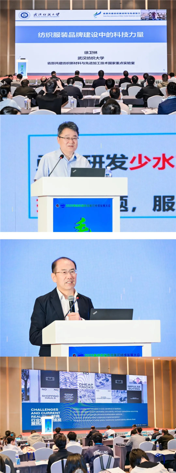 武漢紡織大學(xué)徐衛(wèi)林院士、東華大學(xué)毛志平教授、青島大學(xué)房寬峻教授、路易斯安那大學(xué)劉傳蘭教授分別為大會(huì)作了精彩主旨報(bào)告。徐衛(wèi)林的線上報(bào)告以“科技力量在紡織服裝品牌建設(shè)中的作用”為核心,從纖維材料創(chuàng)新、紡紗技術(shù)革新、織物后整理與標(biāo)準(zhǔn)檢測(cè)三個(gè)維度展開,指出科技創(chuàng)新是提升品牌核心競(jìng)爭(zhēng)力的關(guān)鍵要素。并結(jié)合國(guó)內(nèi)外典型案例,分析了科技創(chuàng)新推動(dòng)品牌價(jià)值提升的路徑,強(qiáng)調(diào)我國(guó)制造企業(yè)需深化產(chǎn)學(xué)研協(xié)同創(chuàng)新,將科技研發(fā)成果轉(zhuǎn)化為品牌差異化優(yōu)勢(shì),為提升中國(guó)紡織服裝行業(yè)的國(guó)際影響力注入新動(dòng)能。毛志平圍繞聚酯纖維筒子紗超臨界CO2無(wú)水染色技術(shù),分享了其團(tuán)隊(duì)在ScCO2流體染色三大關(guān)鍵問(wèn)題:染料溶解行為調(diào)控方法,高效率上染工藝、染色成套裝備等方面取得的研究成果,并介紹了其工程化生產(chǎn)產(chǎn)品質(zhì)量與節(jié)能減排效果,從源頭上解決印染行業(yè)的淡水資源消耗和廢水排放問(wèn)題。房寬峻介紹了開發(fā)的活性染料無(wú)鹽連續(xù)軋染和濕態(tài)高速噴墨印花技術(shù),通過(guò)對(duì)染整過(guò)程中分子作用機(jī)制的研究,為開發(fā)原創(chuàng)性印染技術(shù)指出了新思路。劉傳蘭針對(duì)當(dāng)前紡織行業(yè)面臨的綠色挑戰(zhàn),借助學(xué)術(shù)研究與實(shí)際案例闡述了數(shù)字化技術(shù)對(duì)時(shí)尚行業(yè)可持續(xù)發(fā)展的推動(dòng)作用,呼吁我國(guó)紡織行業(yè)應(yīng)緊抓機(jī)遇,引領(lǐng)全球可持續(xù)時(shí)尚轉(zhuǎn)型。