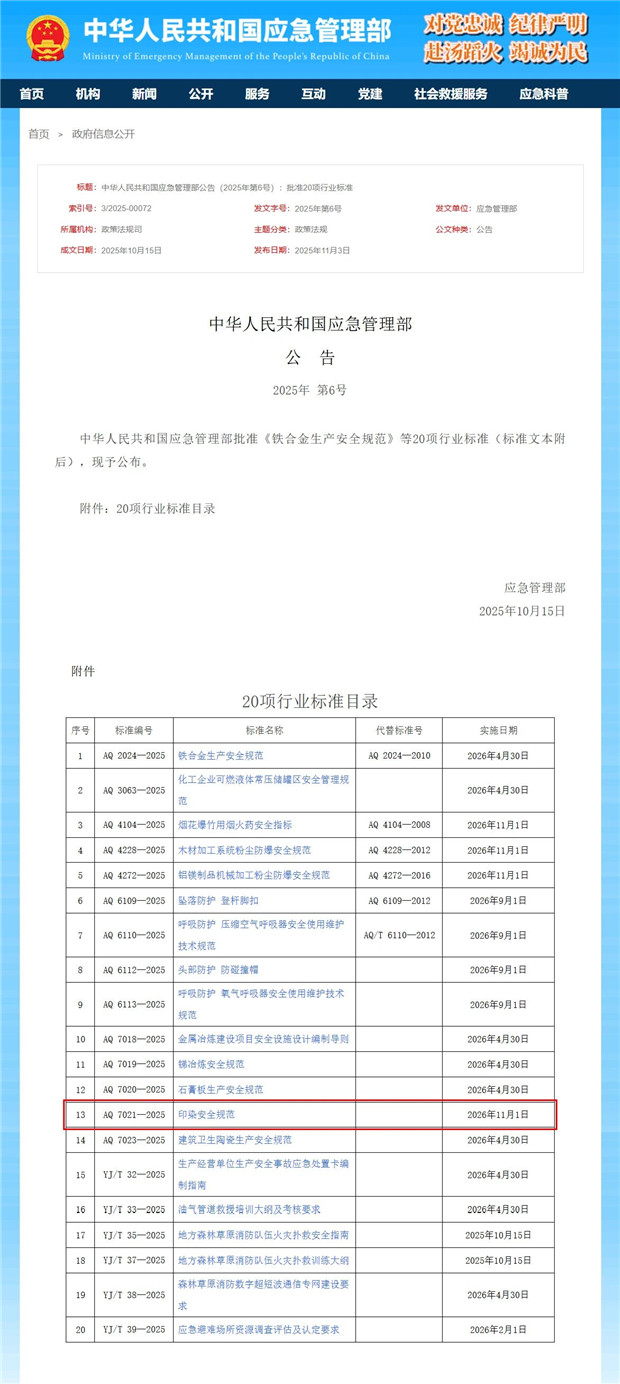 為推動(dòng)印染企業(yè)強(qiáng)化安全管理,提升安全保障能力,應(yīng)急管理部組織制定了強(qiáng)制性行業(yè)標(biāo)準(zhǔn)《印染安全規(guī)范》(AQ 7021-2025),并于近期正式發(fā)布。