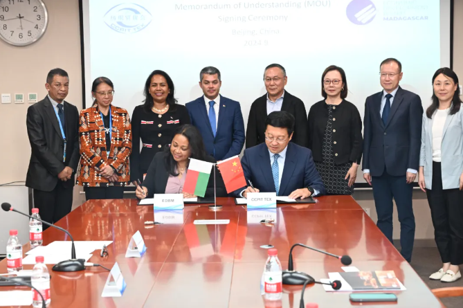 2024年9月5日,中國(guó)國(guó)際貿(mào)易促進(jìn)委員會(huì)紡織行業(yè)分會(huì)和馬達(dá)加斯加經(jīng)濟(jì)發(fā)展局簽署合作備忘錄儀式在北京舉行。