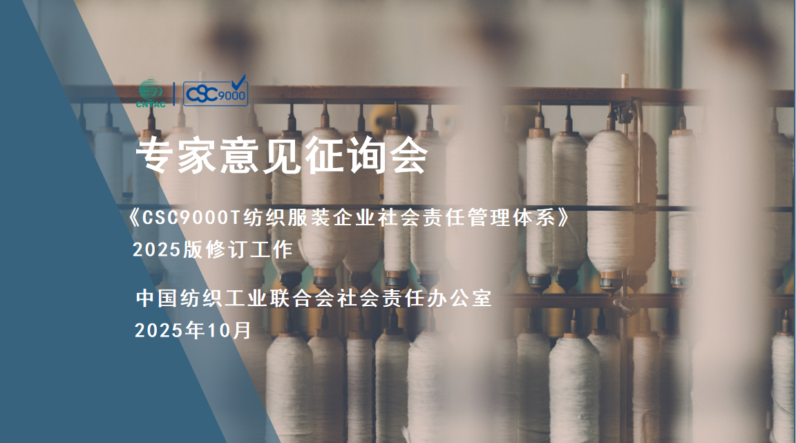 中國(guó)紡織工業(yè)聯(lián)合會(huì)社會(huì)責(zé)任辦公室在線上成功召開(kāi)“《CSC9000T紡織服裝企業(yè)社會(huì)責(zé)任管理體系(2025版)》專(zhuān)家意見(jiàn)征詢(xún)會(huì)”。