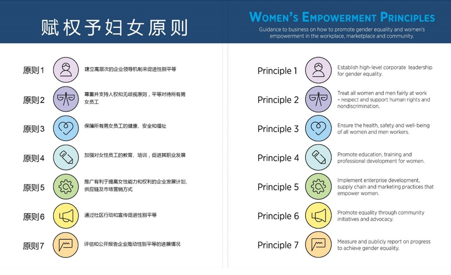 “賦權(quán)予婦女原則”(WEPs)是由聯(lián)合國(guó)婦女署與聯(lián)合國(guó)全球契約組織共同發(fā)起的行動(dòng)倡議,它包含7條原則,指導(dǎo)企業(yè)在工作場(chǎng)所、市場(chǎng)和社區(qū)中推動(dòng)性別平等。迄今為止,全球范圍內(nèi),包括阿爾卡特朗訊、宜家、微軟和聯(lián)合利華等4400多家公司和智聯(lián)招聘、等190多家中國(guó)企業(yè)都已簽署并承諾采取行動(dòng)來踐行WEPs。 |