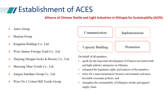 “中國(guó)(埃塞)紡織輕工企業(yè)可持續(xù)發(fā)展聯(lián)盟”會(huì)員和宗旨 會(huì)議還討論了項(xiàng)目后期進(jìn)一步提升埃塞俄比亞紡織業(yè)可持續(xù)發(fā)展能力的計(jì)劃,并提出了明確的工作構(gòu)想與實(shí)施路徑。