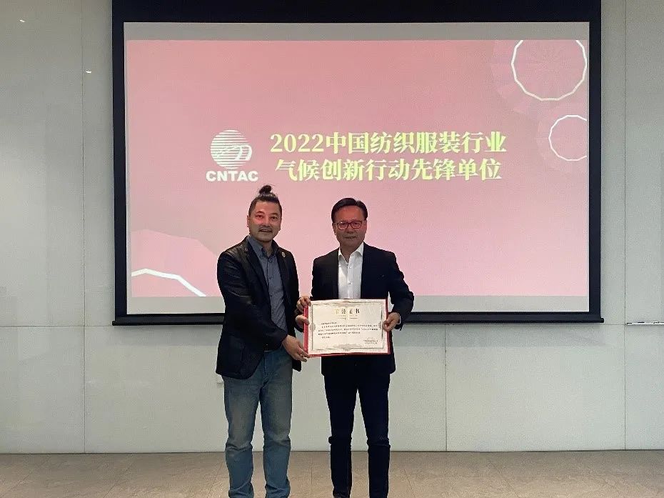 圖為“2022中國(guó)紡織服裝行業(yè)氣候創(chuàng)新行動(dòng)先鋒單位”頒獎(jiǎng)現(xiàn)場(chǎng)