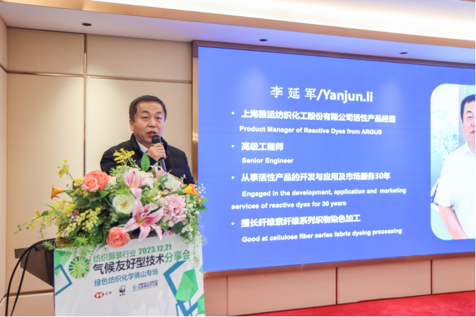 李延軍先生分享了雅運公司針對棉織物的低溫染色及高效節(jié)能水洗方案。此方案旨在實現(xiàn)節(jié)能低碳目標(biāo),通過創(chuàng)新的低溫染色技術(shù)和高效的水洗流程,顯著減少能耗和碳排放。他詳細(xì)介紹了該技術(shù)的具體應(yīng)用,強(qiáng)調(diào)其在提升環(huán)保性能和生產(chǎn)效率方面的優(yōu)勢,為紡織行業(yè)的綠色轉(zhuǎn)型提供了重要的參考和示范。