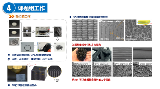 史寶會老師介紹了纖維復合材料的回收意義、回收方法、以及回收再利用技術(shù)。史寶會老師指出,機械回收法是纖維復合材料回收的最主要方法。目前,纖維復合材料回收再利用技術(shù)主要分為四種:直接成型、非織造布直接成型、纖維整理后成型技術(shù)、以及碳纖維織造浸膠。另外,史寶會老師團隊研究發(fā)現(xiàn),3D打印回收碳纖維是隨著打印部件的方向而取向的,同時發(fā)現(xiàn)打印的短碳纖維熱塑復合材料部件具有優(yōu)異的熱穩(wěn)定性,且可用于多種場景,包括服裝的制作,紗線的制作、電池的制作等。