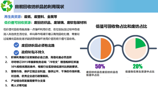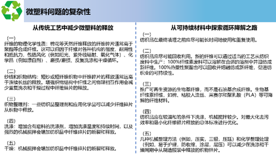 關(guān)曉宇博士首先介紹了“循環(huán)經(jīng)濟”的概念,回收紡織品的利用現(xiàn)狀,以及當前面臨的微塑料問題的復雜性。關(guān)博士指出,如果可以將當前的“線性經(jīng)濟”轉(zhuǎn)變成“循環(huán)經(jīng)濟”,將目前數(shù)量龐大的廢舊紡織服裝利用起來,將是對于“循環(huán)經(jīng)濟”而言,非常大的貢獻。同時,通過不同的形式,比如建立階梯化的利用,對廢舊紡織品高值化的開發(fā)和應用,以及呼吁政府進行一定的增值稅減免以鼓勵企業(yè)進行廢舊紡織品回收和開發(fā),將是紡織材料行業(yè)未來的出路。在應對微塑料問題方面,關(guān)博士提出,新材料的誕生,并不能完全解決已出現(xiàn)的微塑料問題,比如生物基塑料在分解時,會減少土壤中的營養(yǎng)成分。