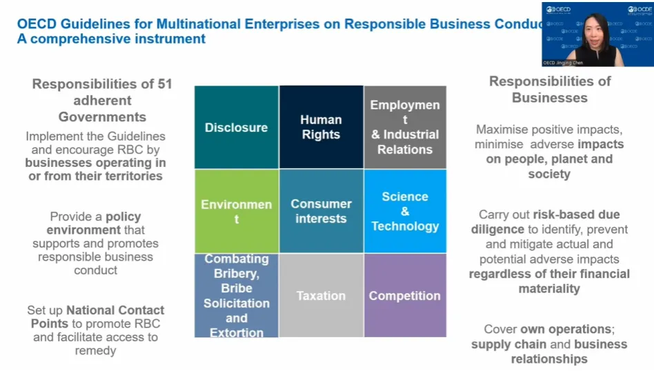經(jīng)合組織(OECD)金融和企業(yè)事務(wù)局負(fù)責(zé)任商業(yè)行為中心政策顧問及國別負(fù)責(zé)人陳晶晶女士通過視頻形式介紹了經(jīng)合組織的盡責(zé)管理標(biāo)準(zhǔn)、方法及其對(duì)品牌與供應(yīng)商關(guān)系的影響。