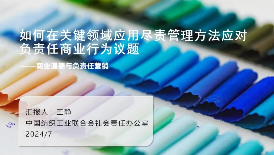 中國紡織工業(yè)聯(lián)合會(huì)社會(huì)責(zé)任辦公室研究員王靜女士就《如何在關(guān)鍵領(lǐng)域應(yīng)用盡責(zé)管理方法應(yīng)對(duì)負(fù)責(zé)任商業(yè)行為議題》,和參會(huì)嘉賓探討了ESG與盡責(zé)管理的關(guān)系,介紹了行業(yè)營銷實(shí)踐中的常見風(fēng)險(xiǎn)因素,并詳細(xì)解讀了如何運(yùn)用盡責(zé)管理工具管控商業(yè)賄賂與貪腐風(fēng)險(xiǎn),號(hào)召企業(yè)加強(qiáng)合規(guī)管理。