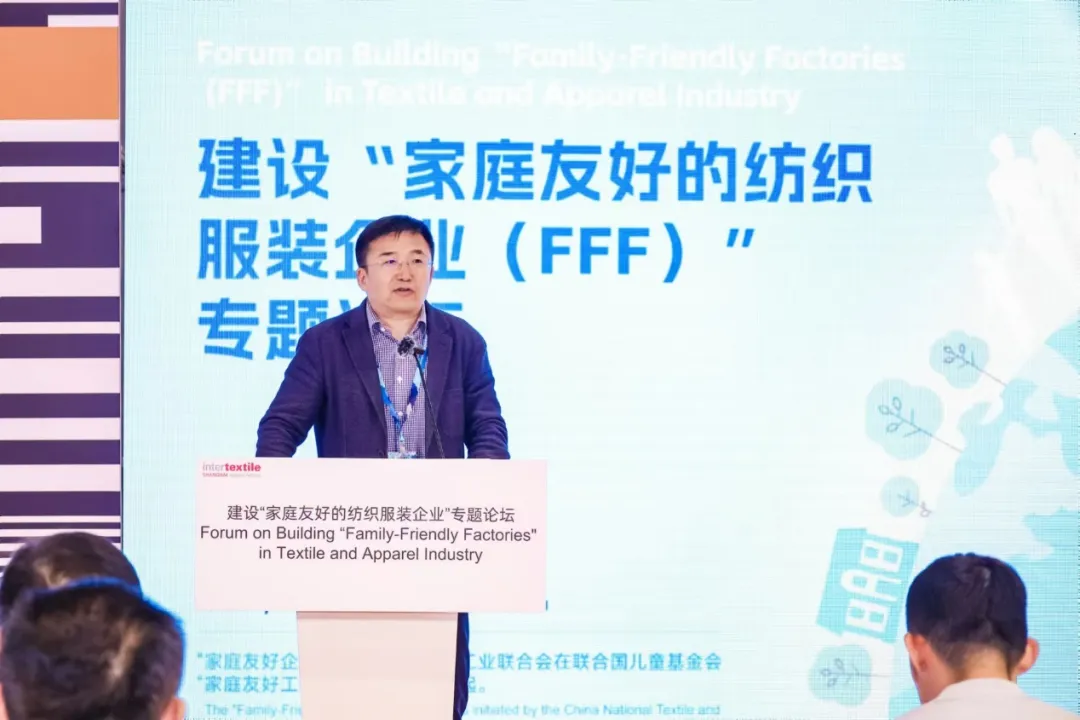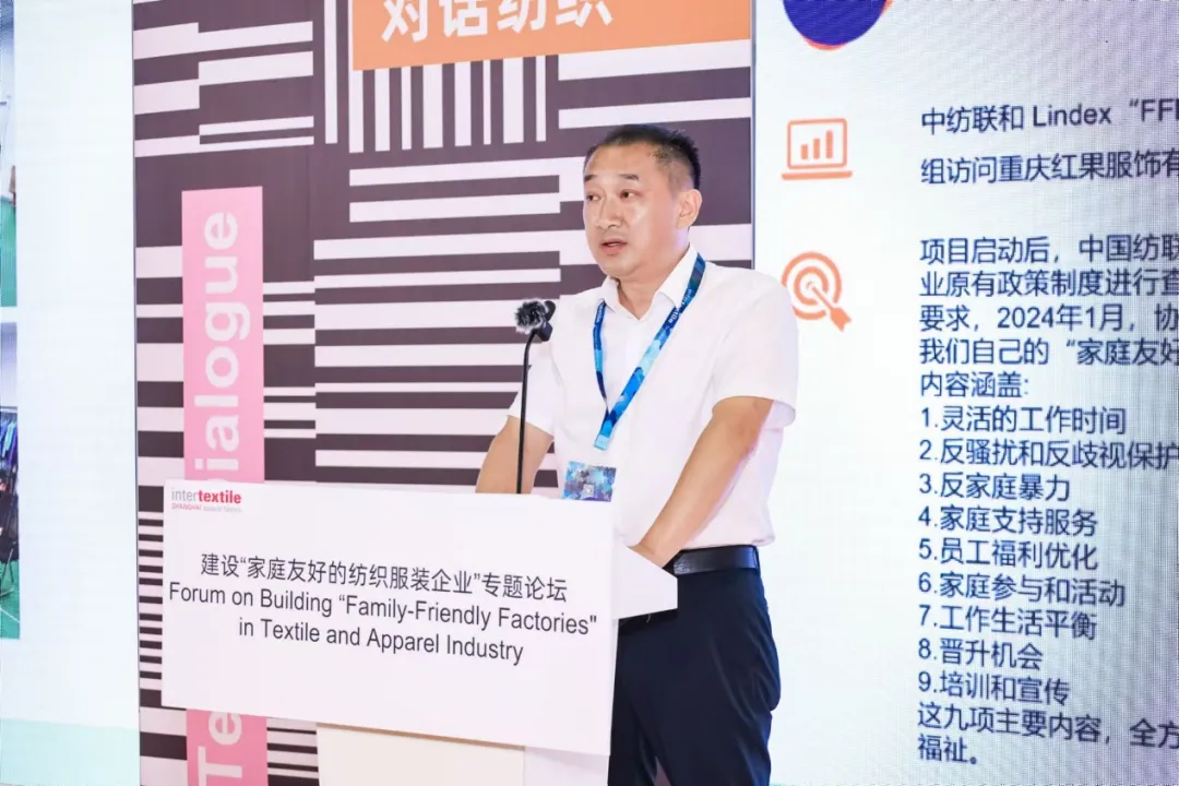 嘉賓分享環(huán)節(jié),聯(lián)合國兒童基金會駐華辦事處營養(yǎng)項目官畢重軍、香港莉迪斯(香港)有限公司上海代表處可持續(xù)發(fā)展區(qū)域經(jīng)理周美琴、蘇州美山子制衣有限公司(愛慕子公司)人力行政總監(jiān)黃麗、全總行業(yè)工會紡織工作部部長趙武、中國紡聯(lián)FFF項目特邀培訓師孫瑩分別代表工會、品牌方及FFF項目代表、以及行業(yè)專家,圍繞當前緊迫的社會需求與企業(yè)現(xiàn)狀,深入探討了如何通過合作與創(chuàng)新,推動家庭友好政策在紡織行業(yè)的落地與實施。各位嘉賓的發(fā)言高屋建瓴,既有對現(xiàn)狀的深刻剖析,也有對未來的美好憧憬。他們提出的資源整合、數(shù)字化轉(zhuǎn)型、優(yōu)質(zhì)資源對接等解決方案,為紡織行業(yè)的轉(zhuǎn)型升級提供了寶貴的思路與方向。這些方案不僅有助于實現(xiàn)工作與生活的平衡,更將促進企業(yè)與社會的和諧共生,推動紡織行業(yè)向更加綠色、可持續(xù)的方向發(fā)展。