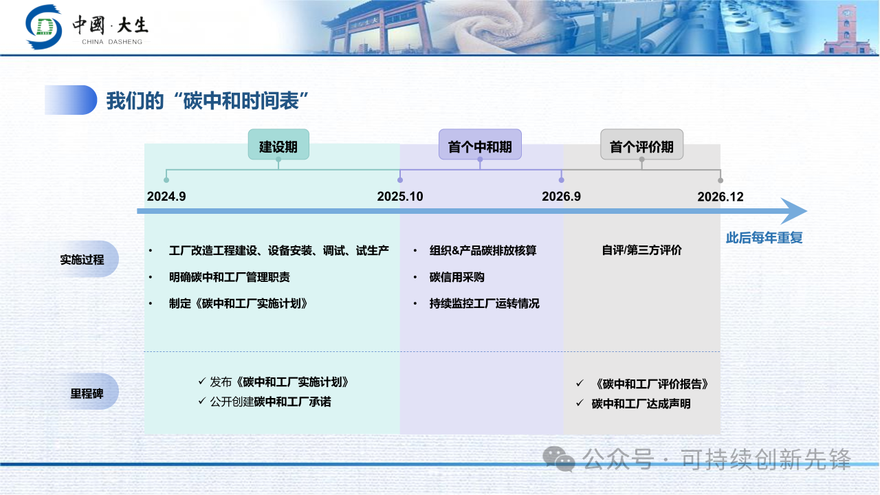 根據(jù)《T/CNTAC 187—2023〈紡織行業(yè)碳中和工廠創(chuàng)建和評(píng)價(jià)技術(shù)規(guī)范〉》,大生集團(tuán)制定了詳細(xì)的碳中和實(shí)施計(jì)劃:將全面盤查工廠溫室氣體排放,推進(jìn)節(jié)能技改、分布式光伏建設(shè)、儲(chǔ)能電站投用及綠電采購(gòu)等項(xiàng)目,對(duì)無(wú)法通過(guò)技術(shù)手段消除的剩余排放實(shí)施碳抵消,最終實(shí)現(xiàn)工廠運(yùn)營(yíng)范圍內(nèi)的碳中和。